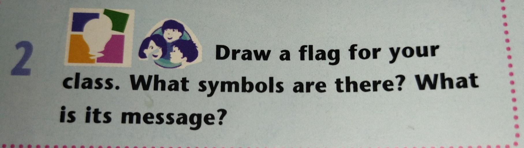 Friendly, kind, cheerful - that’s what nouns can describe our class. In my opinion, the flag of my class would have three major colours. The first one is white, because this colour mean peace. The second one is blue, because it mean comfort and finally green because it’s my favourite colour.