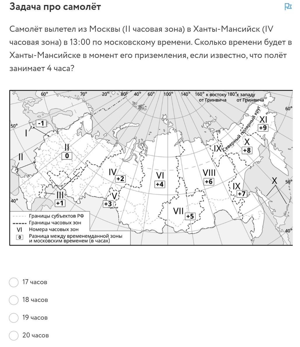 Время в Ханты-Мансийске на 2 часа спешит от Московского. 13+4+2=19