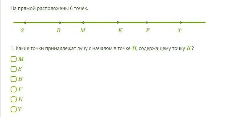 1. Какие точки принадлежат лучу с началом в точке B, содержащему точку K?