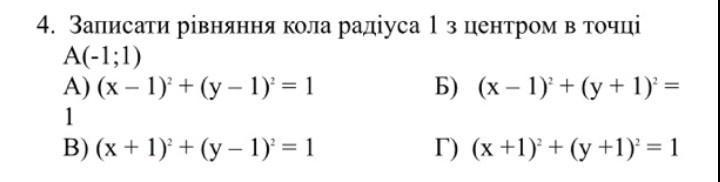 Уравнение окружности радиусом 1 и центром в точке А(-1; 1). Решение. (х-(-1))²+(у-1)²=1; (х+1)²+(у-1)²=1. Ответ: В).