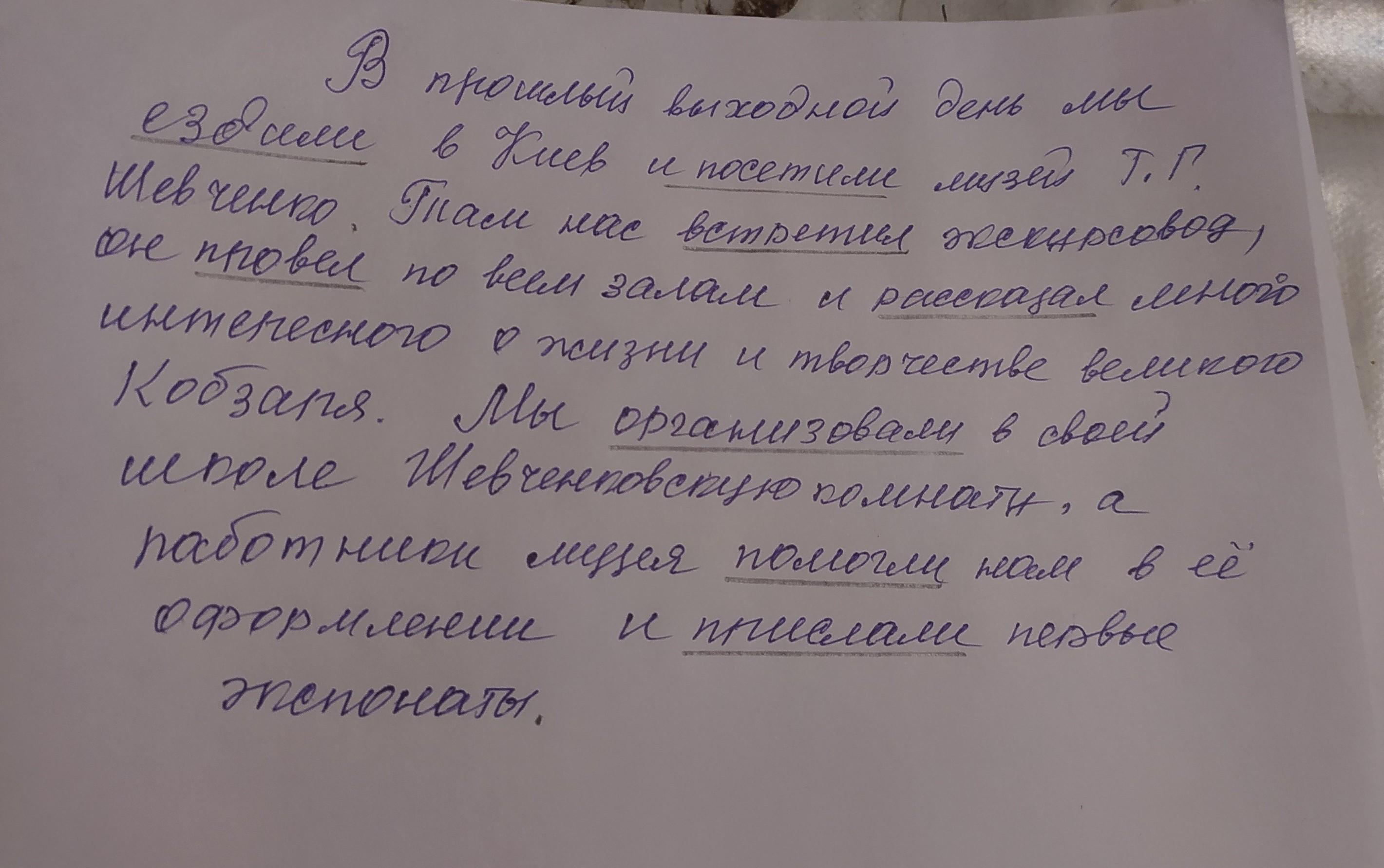 В прошлый выходной день мы ездили в Киев и посетили музей Т. Г. Шевченко. Там нас встретил экскурсовод, он провёл по всем залам и рассказал много интересного о жизни и творчестве великого Кобзаря. Мы решили организовать в своей школе Шевченковскую комнату, а работники музея обещали нам помочь в её оформлении и прислать первые экспонаты.