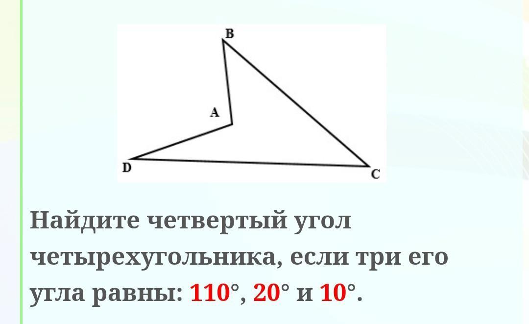 Сначала найдем сумма трех известных углов четырехугольника -- 110*+20*+10*=140*. Сумма всех углов любого четырехугольника равна 360* ⇒ 360*-140*=220*. Ответ. 220*. P.S. * - градус.