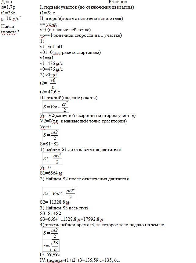 Всего у нас три участка: первый — до отключения двигателя, с ускорением 1,7g. После отключения двигателя ракета достигнет наивысшей точки траектории и упадет, она движется только с ускорением g — это 2 участок. Падение ракеты обратно на землю - третий участок.
