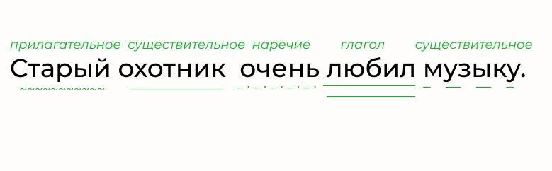 старый (прилагательное, волнистой чертой) охотник ( существительное 1 чертой) очень (наречие, пунктир с точкой) любил(глагол 2 чертами) музыку (существительное, пунктир)
