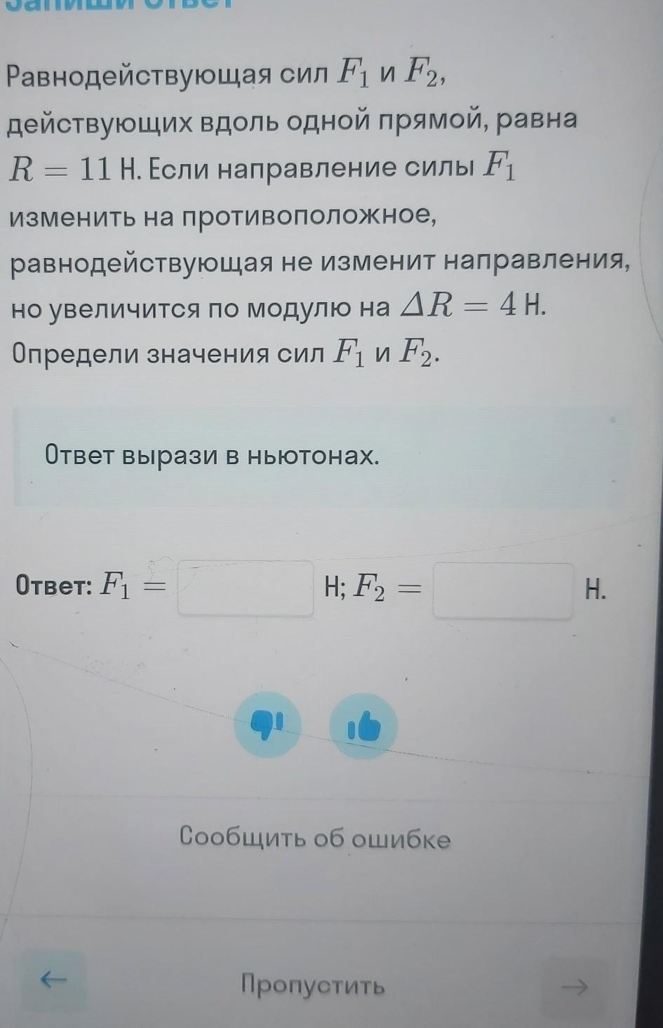 Равнодействующая сил F1 и F2, действующих вдоль одной прямой, равна R = 11H. Если направление силы F изменить на противоположное, равнодействующая не изменит направления, но увеличится по модулю на ДR = 4 Н. Определи значения сил F1 и F2