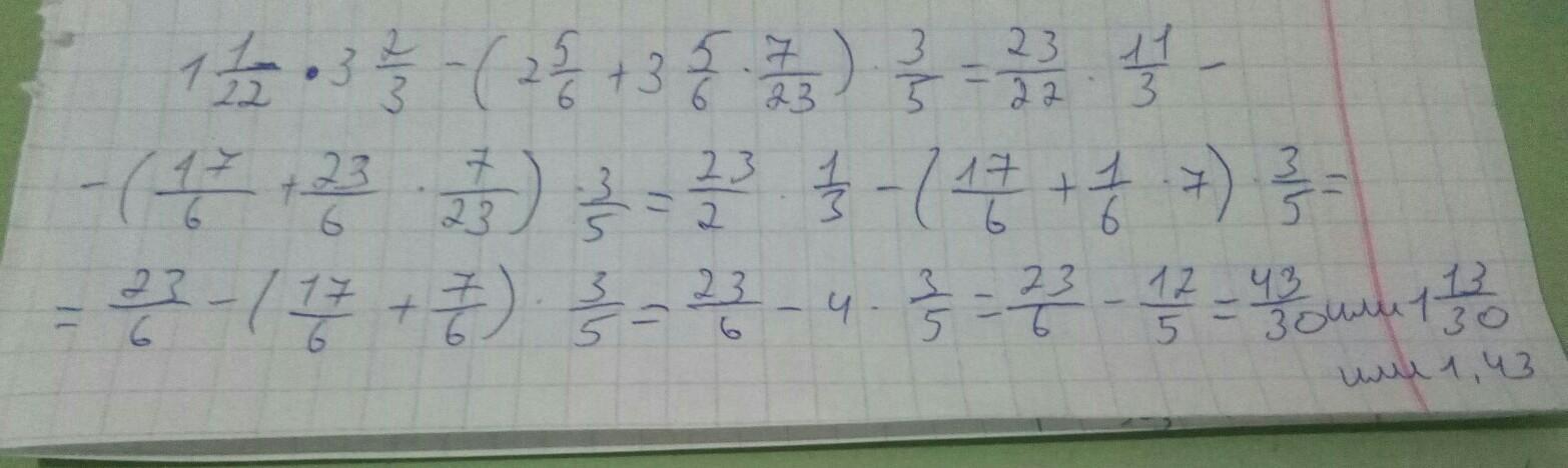 1 1/22*3 2/3-(2 5/6+3 5/6*7/23)*3/5 = 1 13/30
