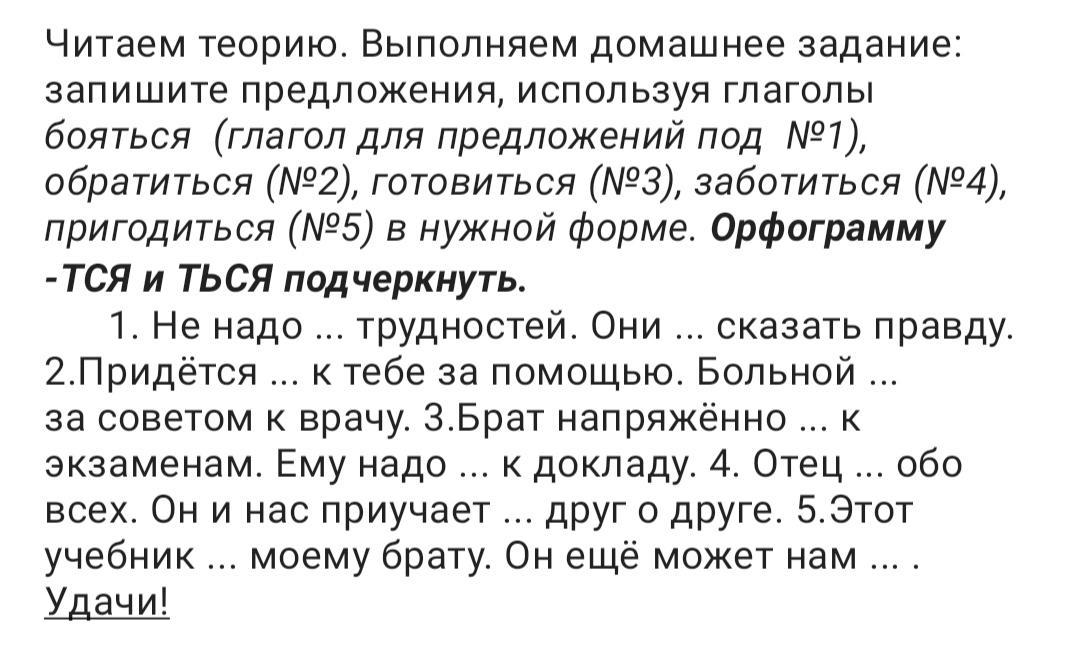1. бояТСЯ, 2 обратиТЬСЯ, 3 готовиТСЯ, 4 заботиТСЯ, 5 пригодиТСЯ.