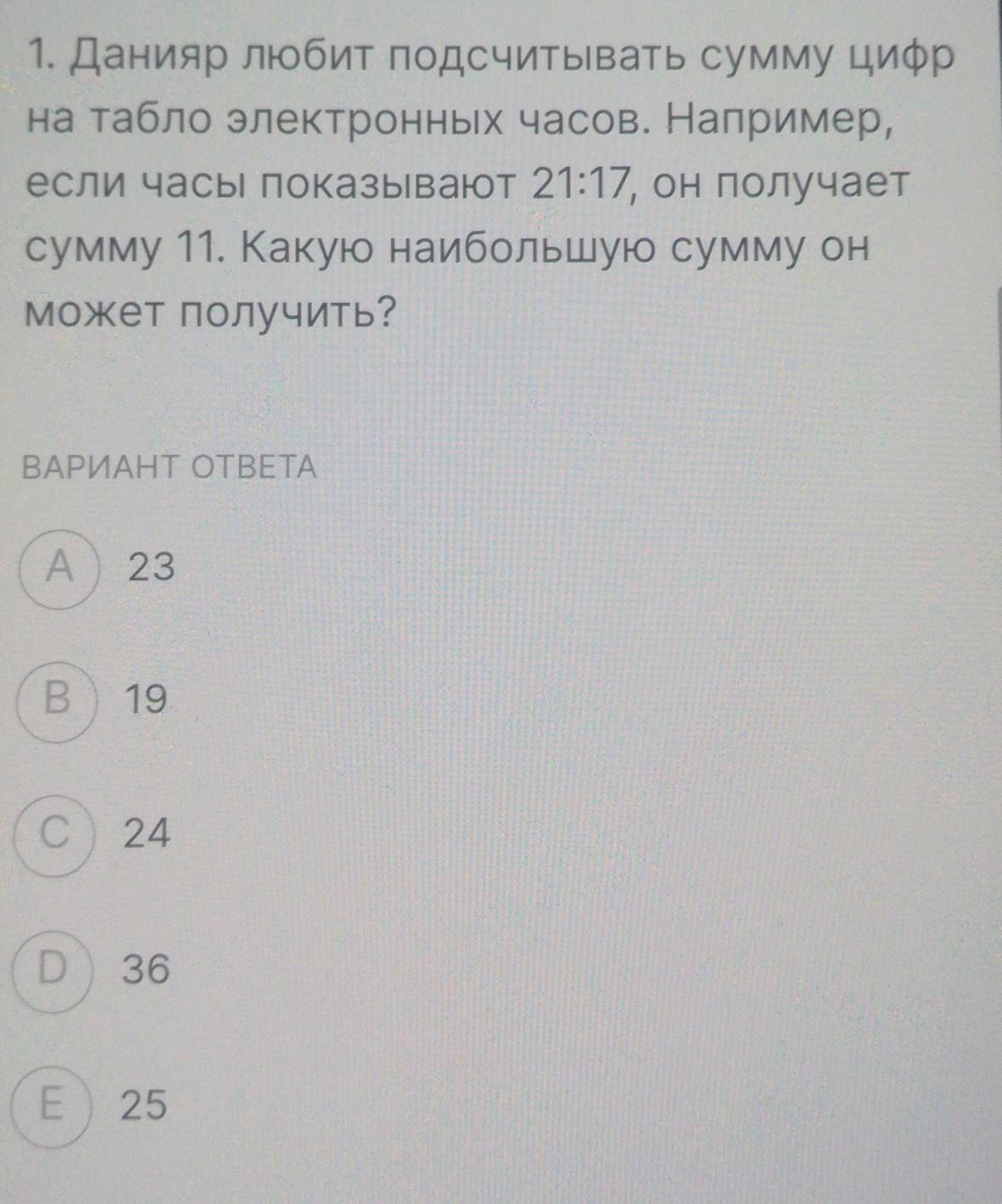 1. Сначала найдем наибольшую сумма из цифр, которую могут показывать электронные часы для "часов".