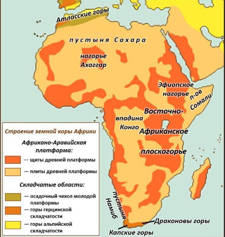 Какие формы рельефа или территории соответствуют щитам в тектоническом строении Африки?