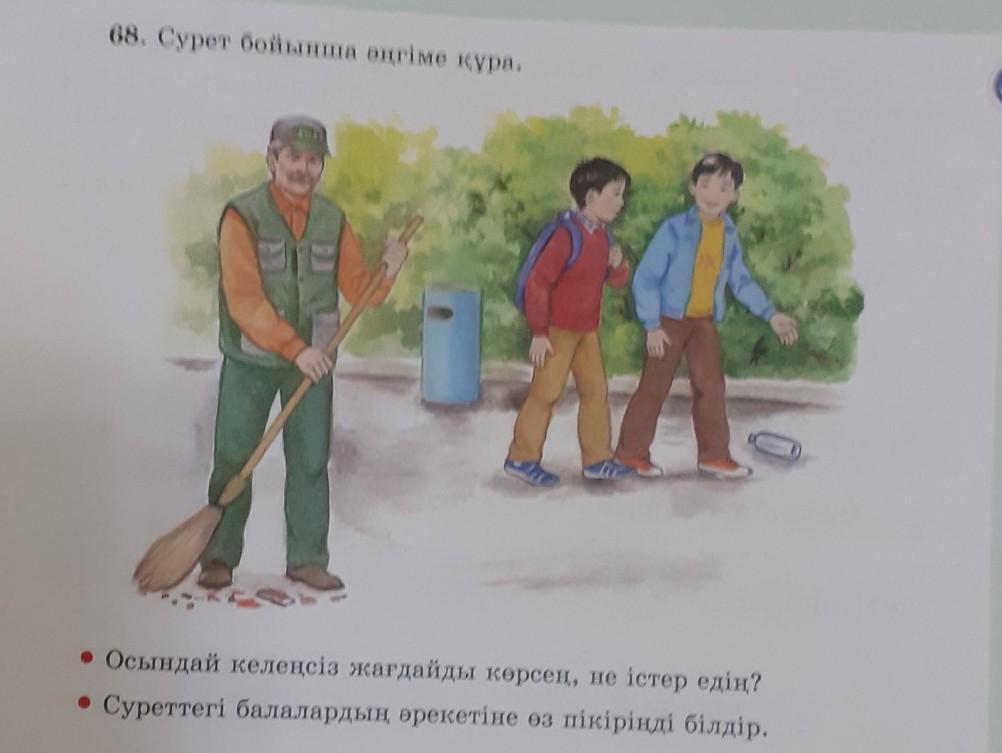 68. Сурет бойынша әңгіме құра. • Осындай келеңсіз жағдайды көрсең, не істер едің? • Суреттегі балалардың әрекетіне өз пікіріңді білдір.