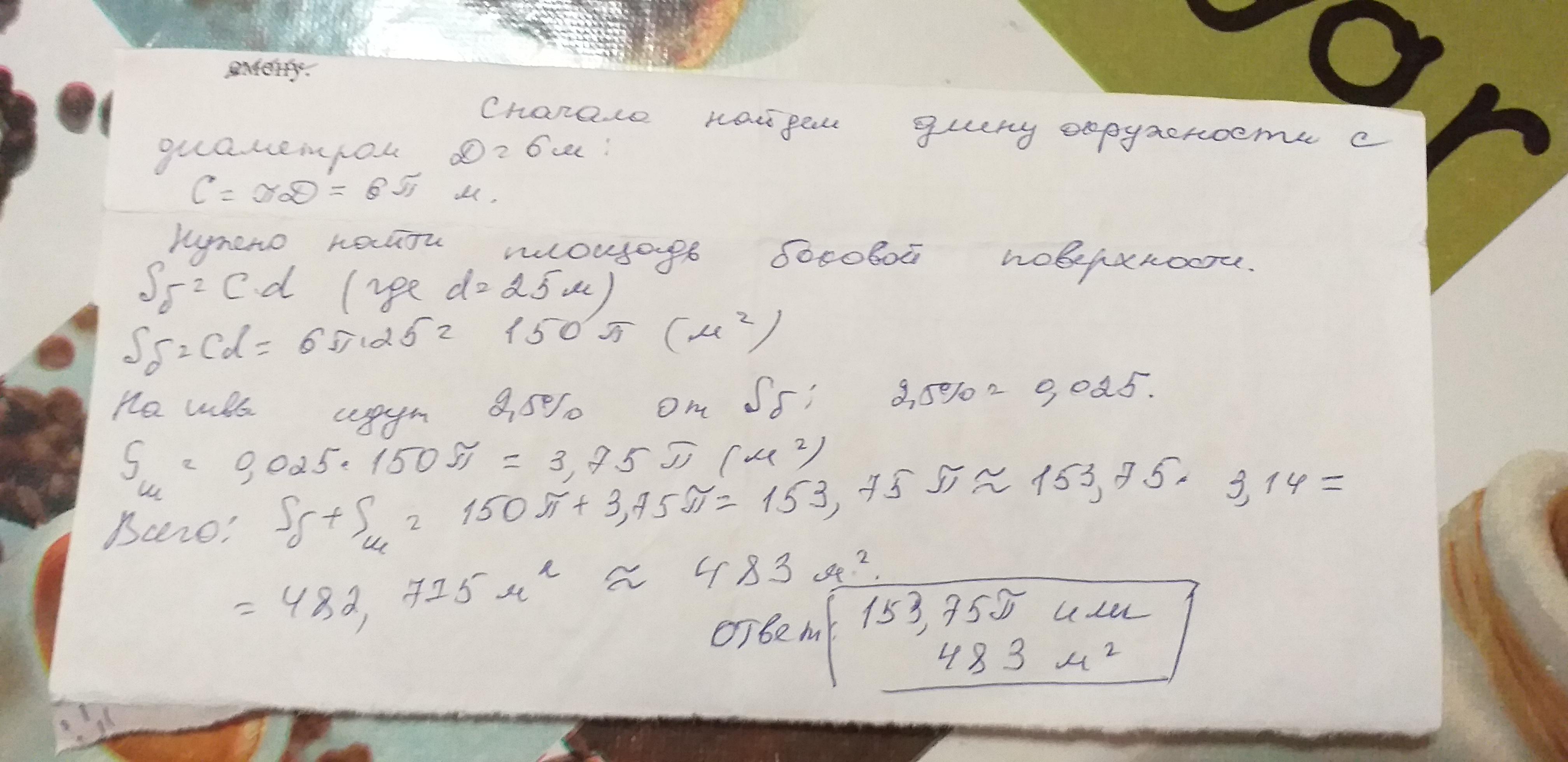сколько жести потребуется на изготовле- ние трубы, изображенной на рисунке 5, длина которой равна 25 м, а диаметр 6м? Учитывать, что на швы расходуются 2,5 % площади боковой поверхности трубы.