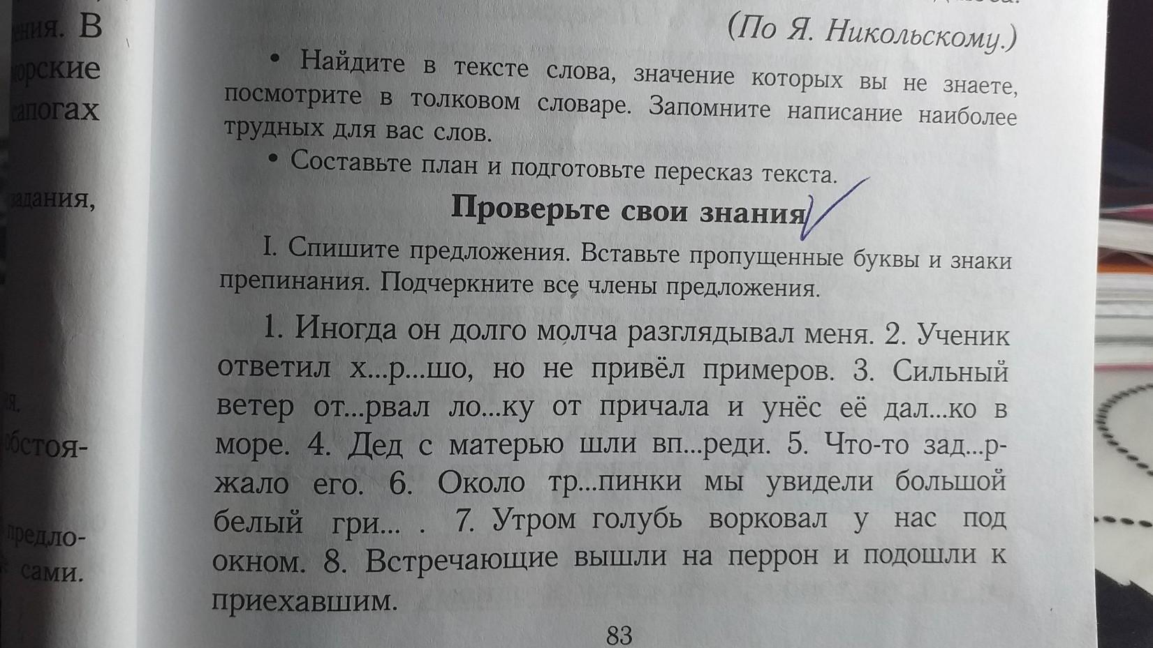 2) ученик ответил хорошо, но не привел примеров. Сильный ветер оторвал лодку от причала и унес ее далеко в море. Дед с матерью шли впереди. Что-то задержало его. Около тропинки мы увидели большой белый гриб. Утром голубь ворковал у нас под окном. Встречающие вышли на перрон и подошли к приехавшим.