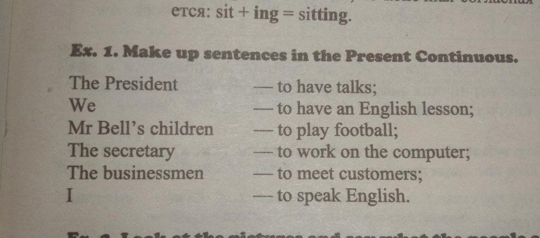 правильно же ,а то я как всегда сомневаюсь в себе The president is talking 2 we are an English lesson 3 Mr Bells children are playing football 4The secretary is working on the computer the businessmen are meeting customers I am speak English