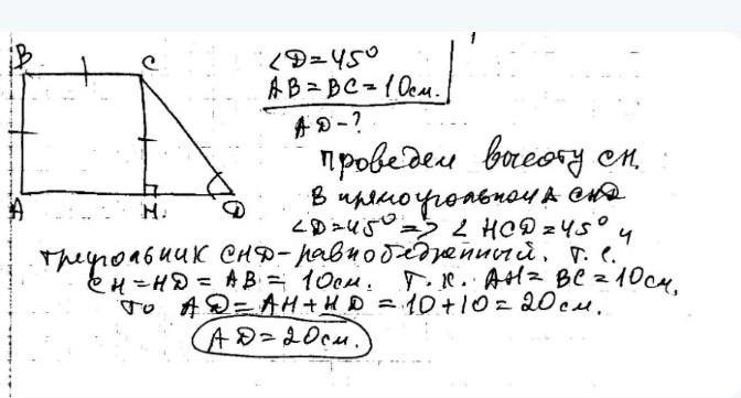 В прямоугольной трапеции острый уголь равен 45градусов .Найдите большие основания если , меньшая боковая сторона и меньшее основание равны 16 см