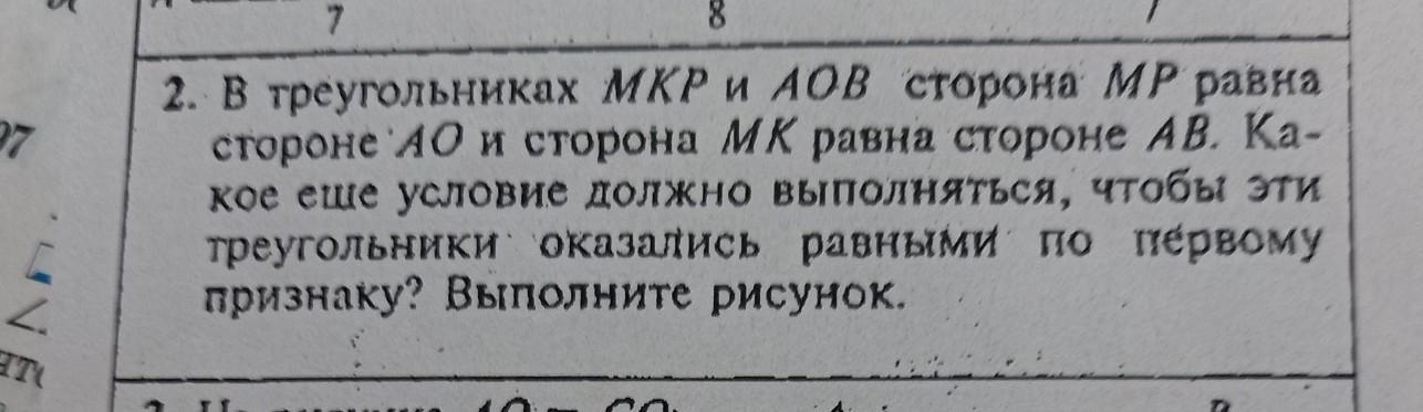 2. В треугольниках МКР и АОВ сторона MP равна стороне АО и сторона МК равна стороне AB. Қа- кое еще условие должно выполняться, чтобы эти треугольники оказались равными по первому признаку? Выполните рисунок.