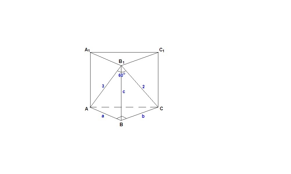 ∠АВ₁С = 60°, АВ₁ = 3, СВ₁ = 2 и двугранный угол с ребром ВВ₁ прямой.