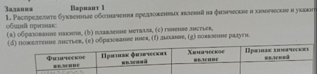 Задания Вариант 1 1. Распределите буквенные обозначения предложенных явлений на физические и химические и укажит общий признак: (с) гниение листьев, (а) образование накипи, (b) плавление металла, (d) пожелтение листьев, (с) образование инея, (1) дыхание, (g) появление радуги. физическое Признак физических Химическое Признак химических явление явлений явление явлений