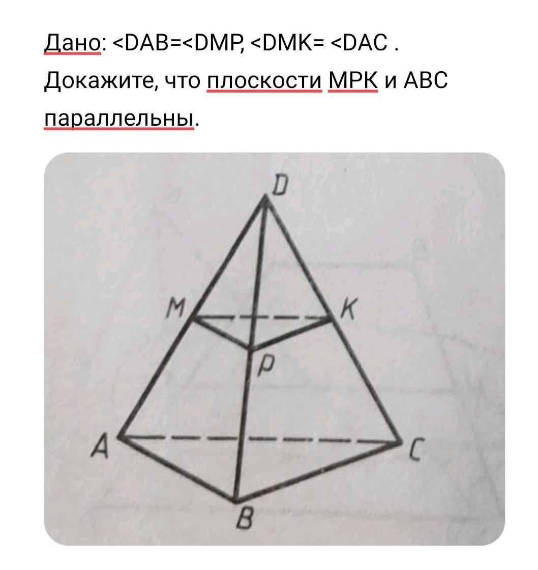 рассмотрим грань ADB, если <DAB=<DMP, это соответственные углы при пересечении прямых АВ и МР секущей AD. Так как они равны-то AB||MP