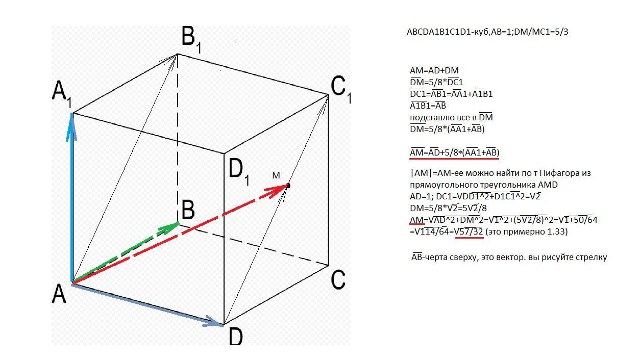 Дан куб ABCDA1B1C1D1 , ребро которого равно 1 см. На диагонали DC1 его грани отметили точку М так , что DM:MC1=5:3 1)Выразите вектор AM через векторы АВ, АD и AA1 2) Найти модуль вектора AМ