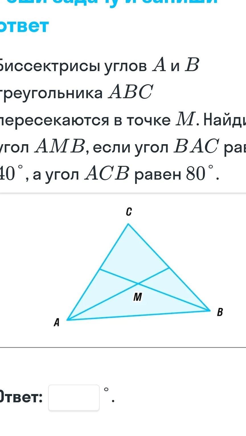 биссектриса углов а и б треугольника абц пересекаются в точке м найди угол амб если угол abc равен 40 в угол асб равен 80