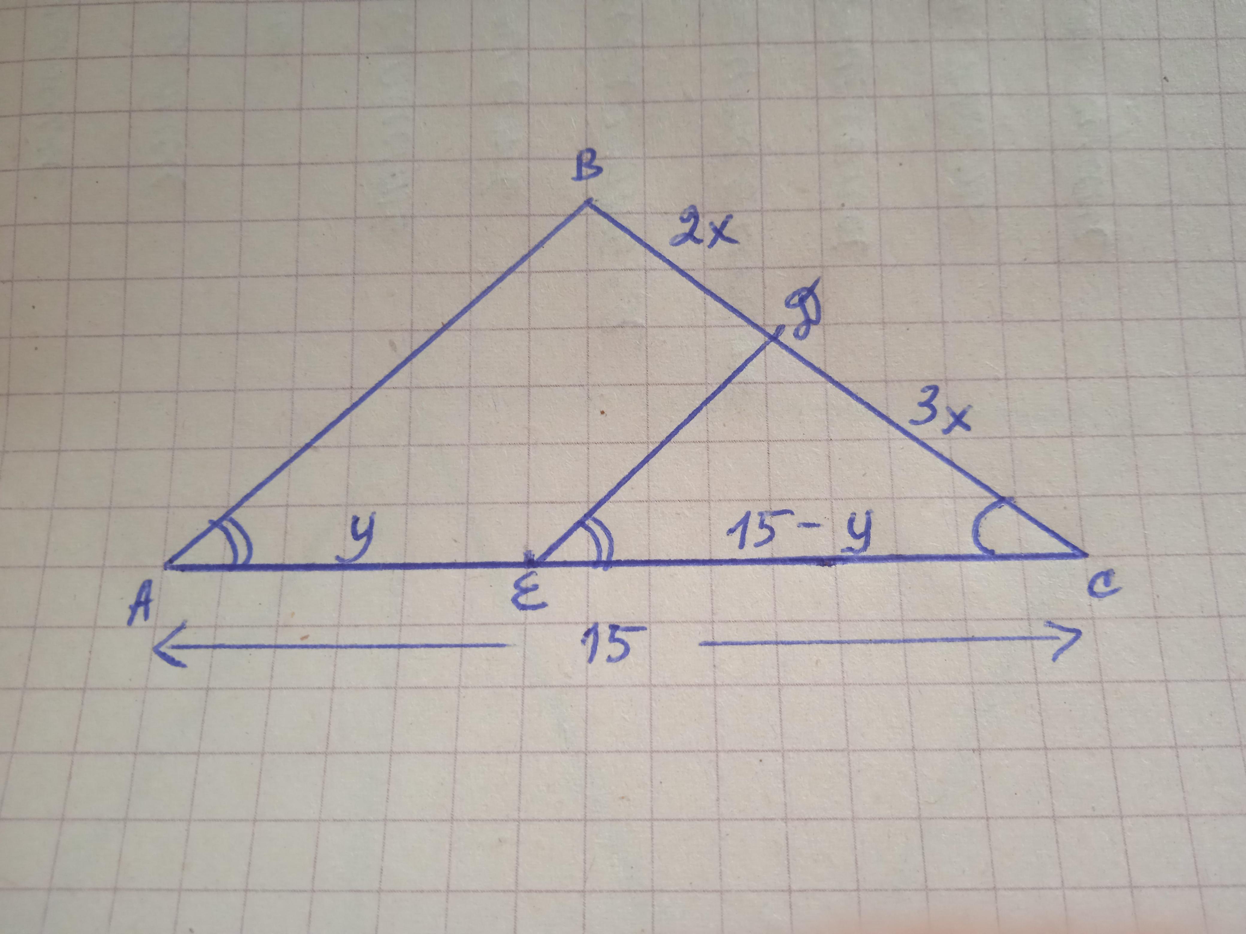 Сторона АС треугольника АВС равна 15 см. На стороне ВС взята точка D так, что BD :DC = 2:3. Через точку D проведена прямая, параллельная АВ и пересекающая АС в точке Е. Чему равны длины отрезков АЕ и EC?