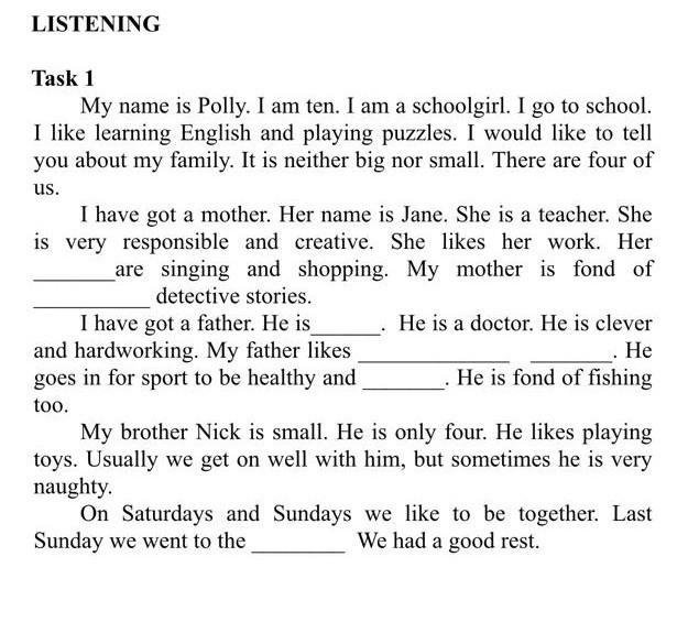 My name is Polly. I am ten. I am a schoolgirl. I go to school. I like learning English and playing puzzles. I would like to tell you about my family. It is neither big nor small. There are four of us.