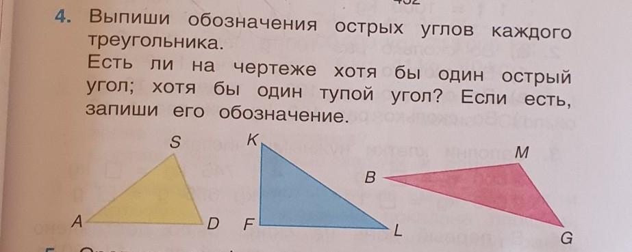 4. Выпиши обозначения острых углов каждого треугольника. Есть ли на чертеже хотя бы один острый угол; хотя бы один тупой угол? Если есть, запиши его обозначение. s K M В А DF