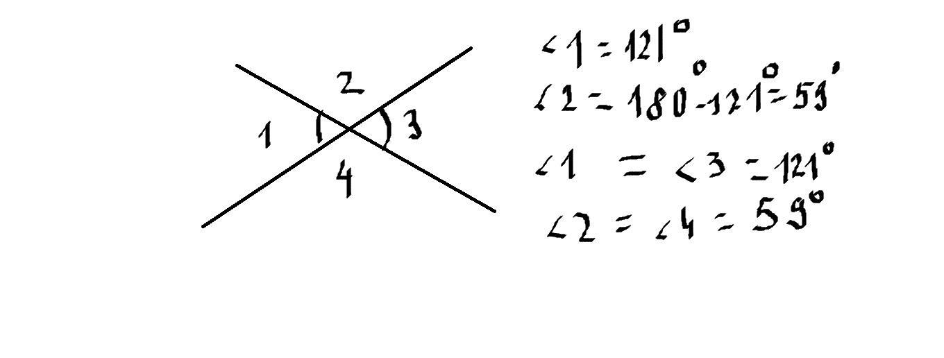 один з кутів що утворилися при перетині двох прямих, дорівнює 121 знайти всі інщі кути. Срочно помогите!!!