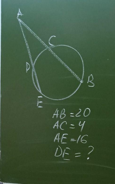 т.е. АD*AE=AC*AВ, подставим данные АD*16=4*20⇒АD=4*20/16=5, значит, DE=AE-AD=16-5=11