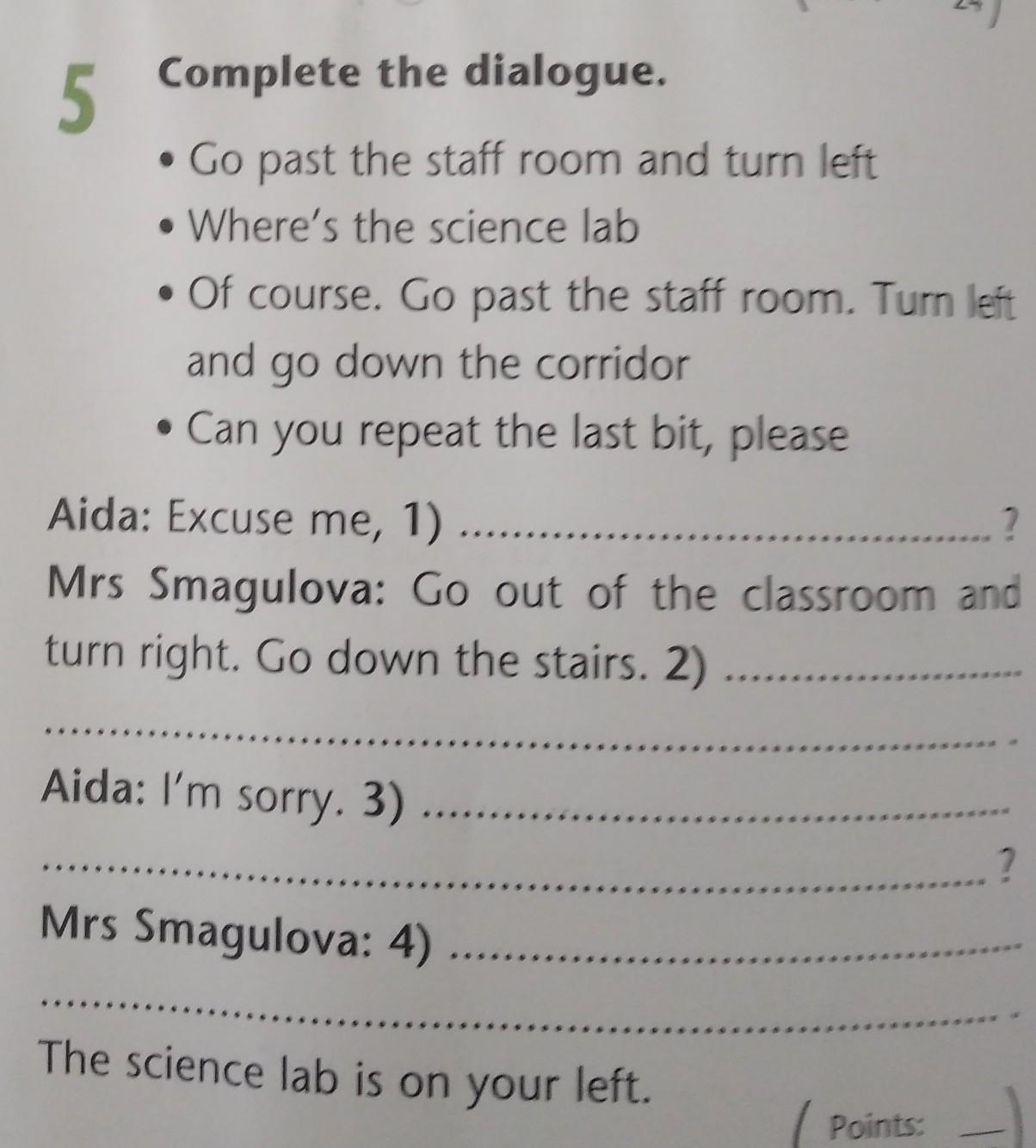 4) Of course. Go past the staff room. Turn left and go down the corridor.