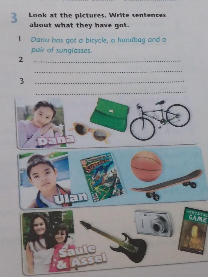 3. Saule and Assel have a guitar, a camera and a book.