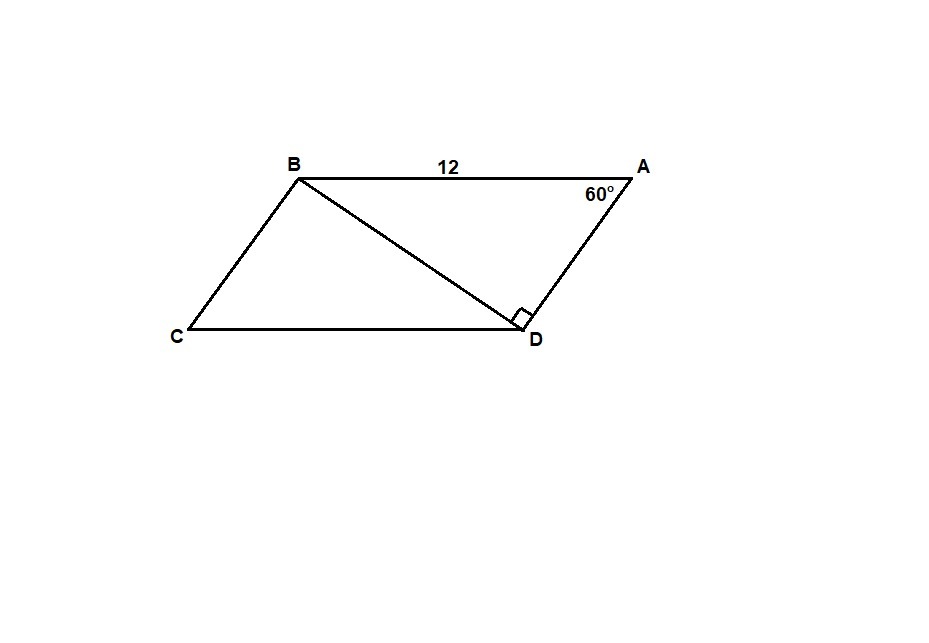 Диагональ BD параллелограмма ABCD перпендикулярна к сторонам AD,AB=12 см,угол А=60°.Найдите площадь паралелограмма ABCD.
