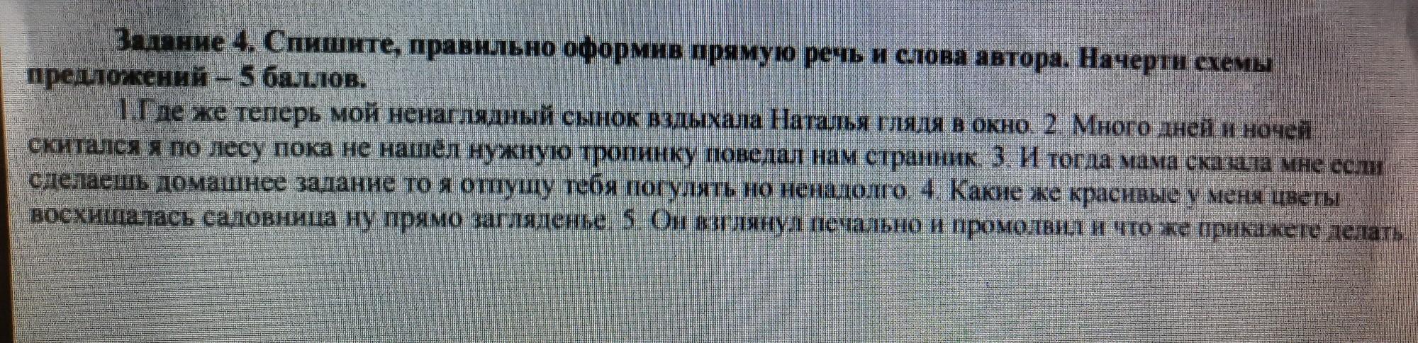 Задание 4. Спишите, правильно оформив прямую речь и слова автора. Начерти схемы предложений – 5 баллов. 1.Где же теперь мой ненаглядный сынок вздыхала Наталья глядя в окно. 2 Много дней и ночей скитался я по лесу пока не нашёл нужную тропинку поведал нам странник. 3. И тогда мама сказала мне если сделаешь домашнее задание то я отпущу тебя погулять но ненадолго. 4. Какие же красивые у меня цветы восхишалась салонница ну прямо загляденье 5. Он взглянул печально и промолвил и что же прикажете делать.
