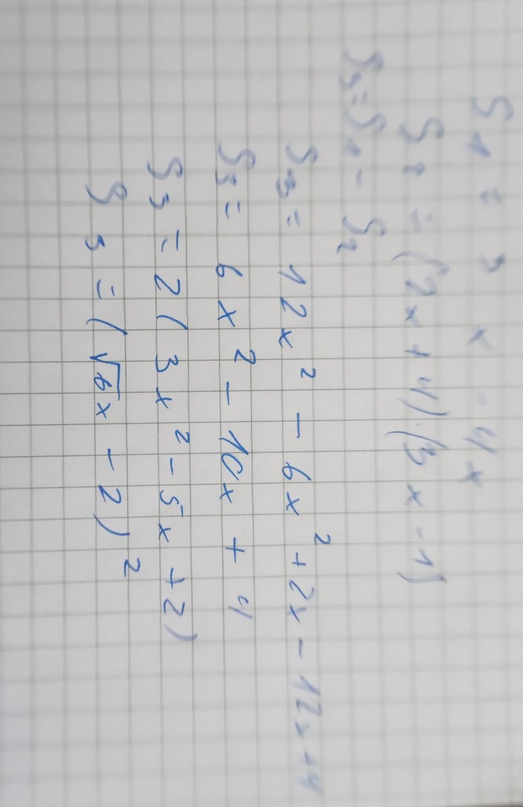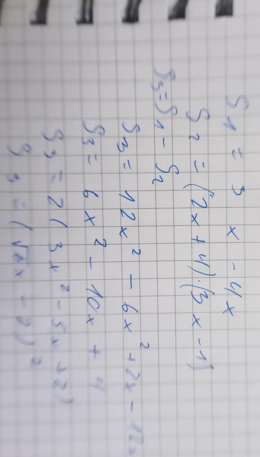 S=4x*3x-(2x-4)*(3x-1)=12x^2-(6x^2-2x-12x+4)=12x^2-6x^2+14x-4=6x^2+14x-4