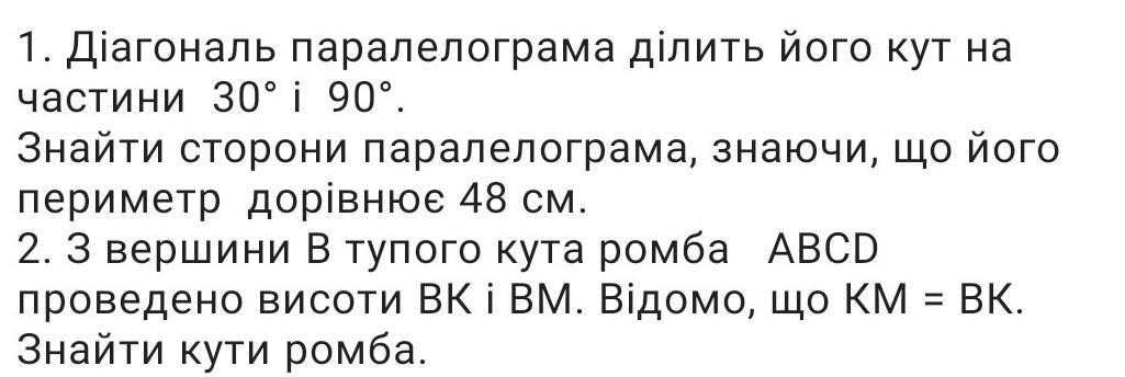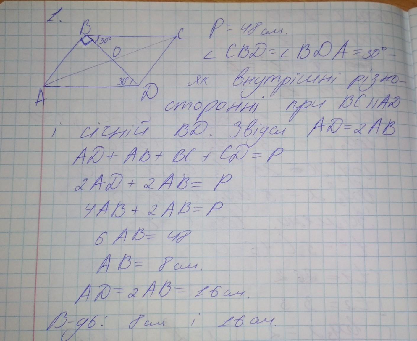 1) Используя прямоугольный треугольник со сторонами 30;60;90. Катет против угла 30°. Одна сторона х вторая 2х. Уравнение х+2х=48/2; 3х=24; х=24/3=8; 8*2=16. Ответ: 8; 16