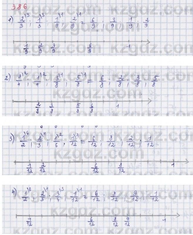 386. Приведите к наименьшему общему знаменателю и изобразите на координатном луче обыкновенные дроби: