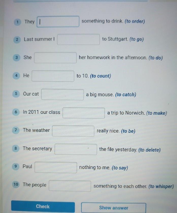 1 They something to drink. (to order) 2 Last summer l to Stuttgart. (to go) 3 She her homework in the afternoon. (to do) He to 10. (to count) 5 Our cat a big mouse. (to catch) 6 In 2011 our class a trip to Norwich. (to make) 7 The weather really nice. (to be) 8 The secretary the file yesterday. (to delete) 9 Paul nothing to me. (to say) 10 The people something to each other. (to whisper) Check Show answer помогите 30 баалоов