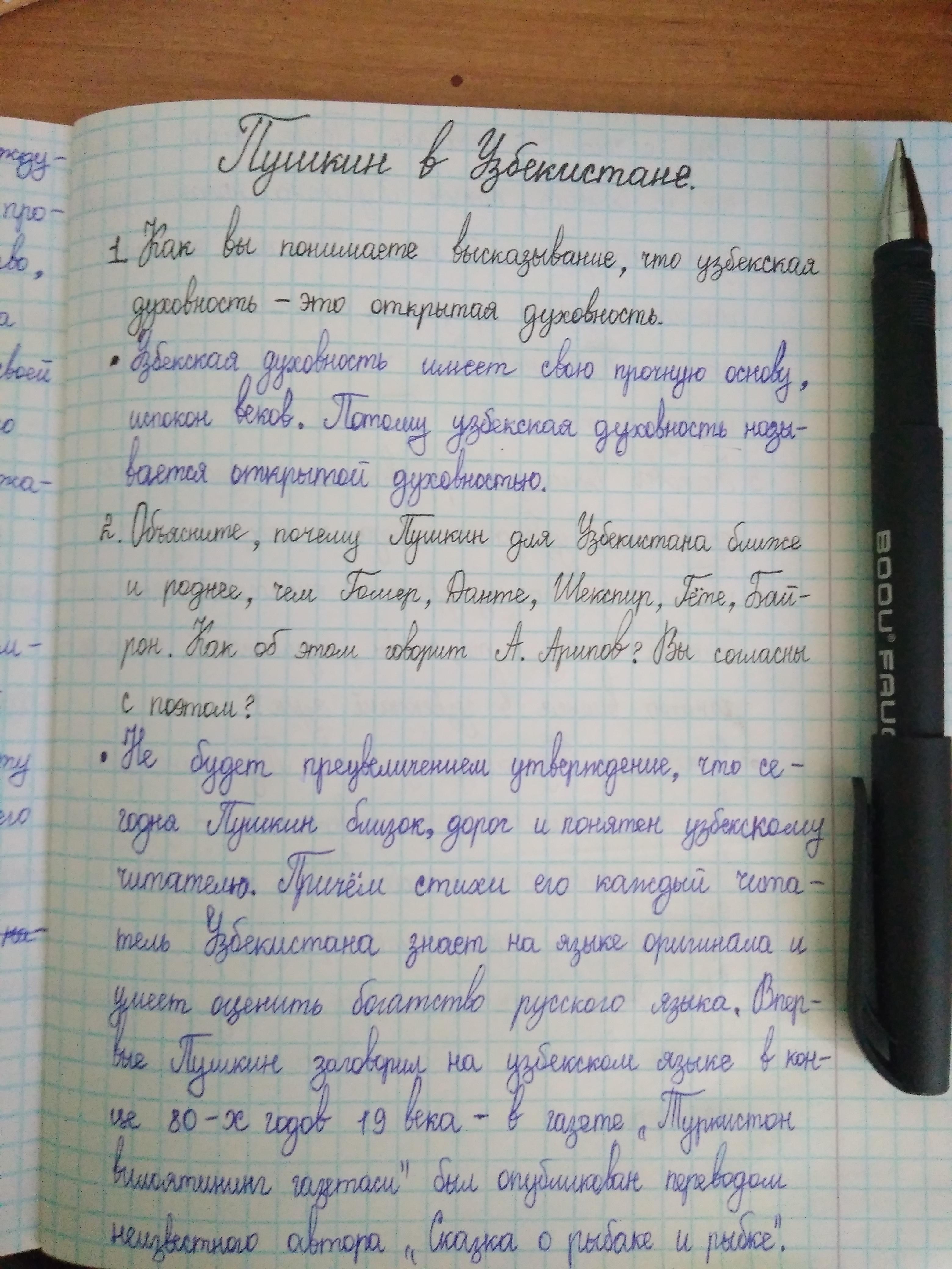 2. Обьясните, почему Пушкин для Узбекистана ближе и роднее, чем Гомер, Данте, Шекспир, Гете, Байрон. Как об этом говорит