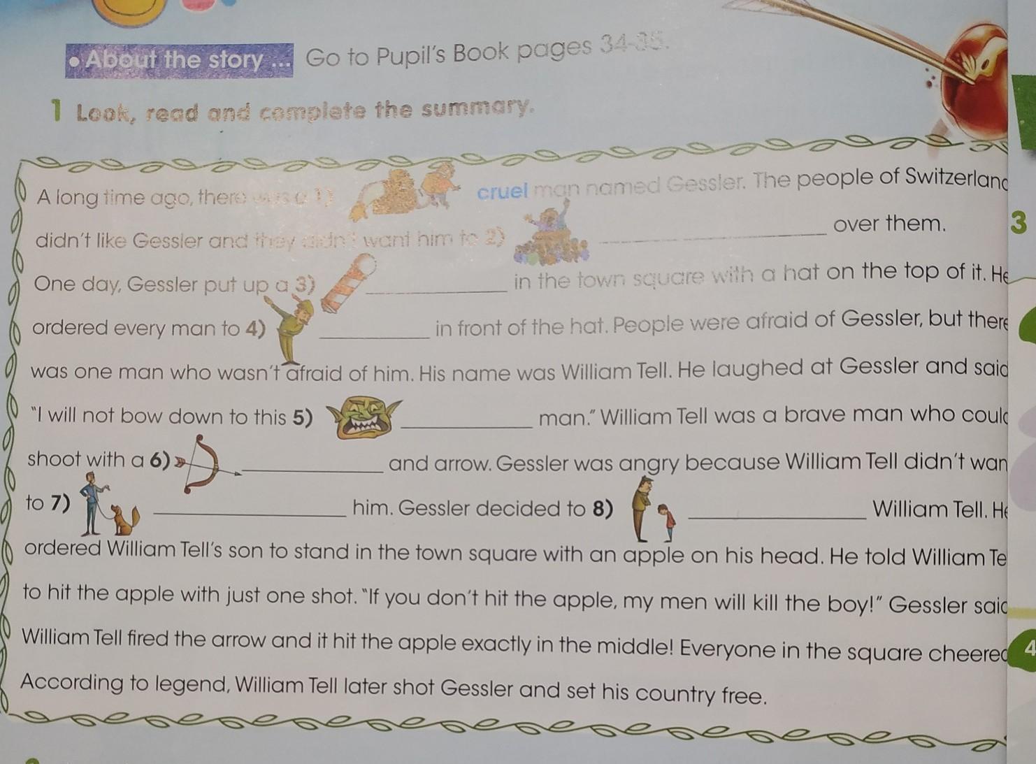 Along time ago, there was a 1) cruel man named Gessler. The people of Switzerland over them. 3 didnt ke Gessler and they didn't want him to 2) One day, Gessler put up a 3) in the town square with a hat on the top of it. He ordered every man to 4) in front of the hat. People were afraid of Gessler, but there was one man who wasn taraid of him. His name was William Tell. He laughed at Gessler and saic "I will not bow down to this 5) man." William Tell was a brave man who coul shoot with a 6) 5 and arrow. Gessler was angry because William Tell didn't wan to 7) 了, him. Gessler decided to 8) 6 William Tell. H ordered William Telis son to stand in the town square with an apple on his head. He told William Te to hit the apple with just one shot. "If you don't hit the apple, my men will kill the boy!" Gessler saic Witam Tell fired the arrow and it hit the apple exactly in the middle! Everyone in the square cheered According to legend, William Tell later shot Gessler and set his country free. помогите пожалуйста сделаю лучшим ответом