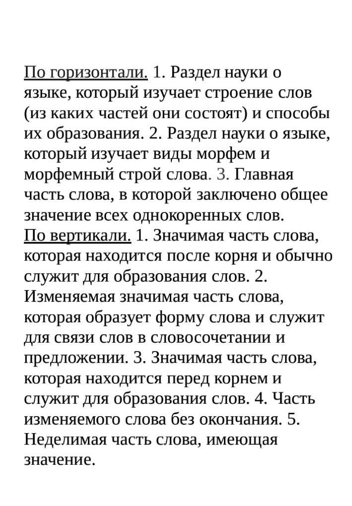 По вертикали: 1- суффикс, 2-окончание, 3- приставка, 4 - основа, 5- морфема