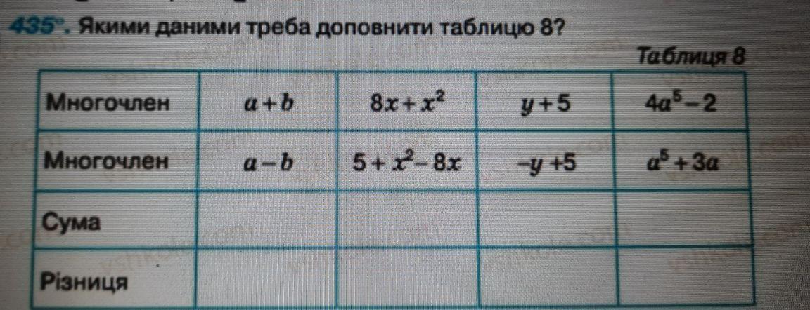 { \overline{\underline{\begin{array}{|c|c|c|c|c|}   \rm Mnogochlen  &a+b & 8x+x^2&y+5 &4a^5-2}}}  \\\\ \rm Mnogochlen &a-b & 5+x^2-8x & -y+5 & a^5+3a   \\\\ \oplus } &2a & 2x^2+5  &10 &  5a^5+3a-2 \\\\ \ominus &2b &16x-5   & 2y & 3a^5-3a-2\end{array}}