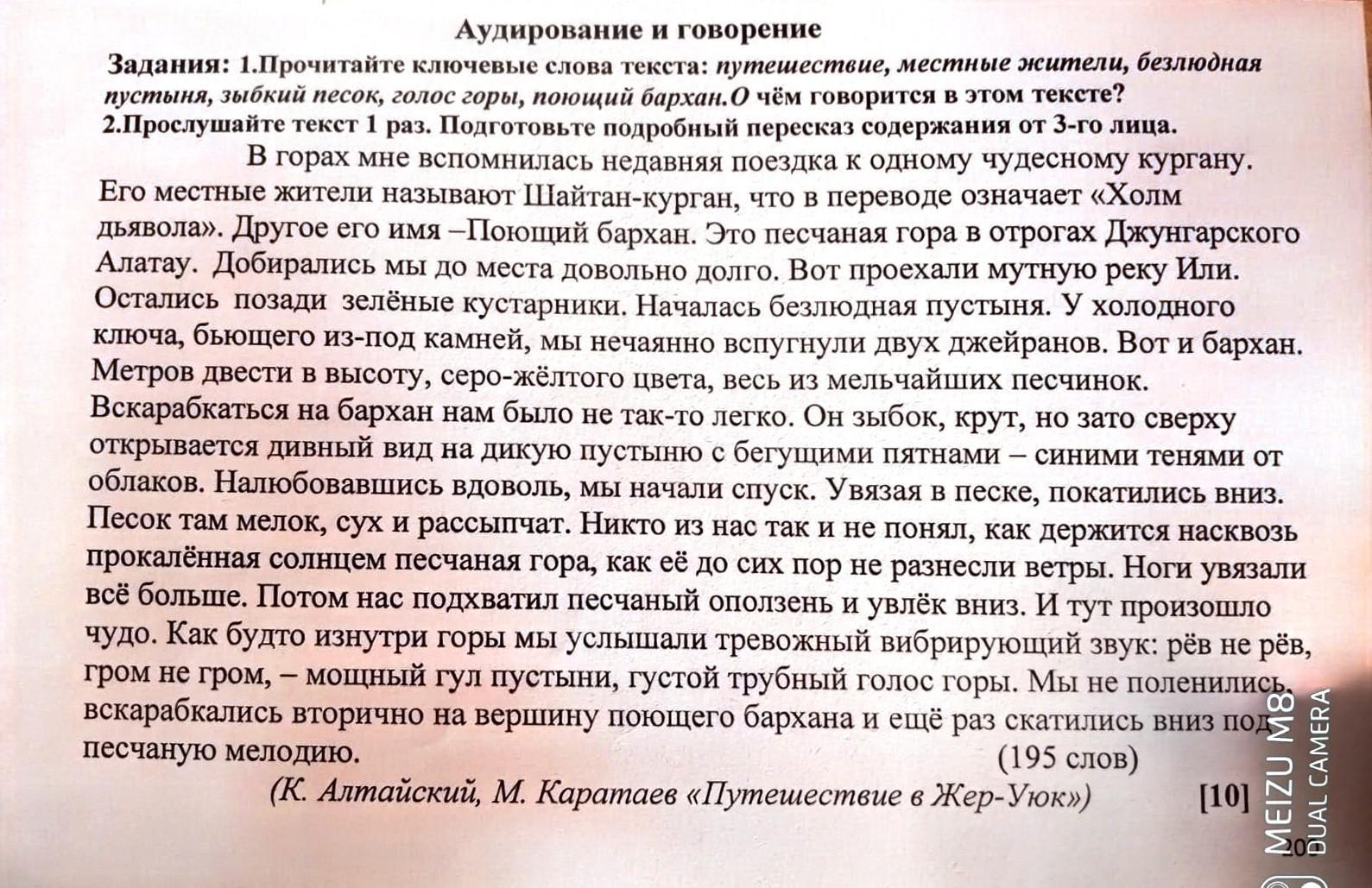 Задание: 1. Прочитайте ключевые слова текста: путешествие, местные жители, безлюдная пустыня, зыбкий песок, голос горы, поющий бархан. О чем говорится в этом тексте? Послушайте текст 1 раз. Подготовьте подробный пересказ содержания от 3-го лица.