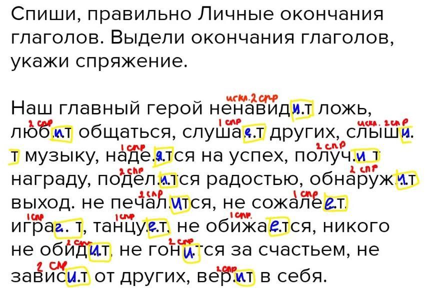 Наш главный герой ненавид...т ложь, люб...т общаться, слуша...т других, слыш... т музыку, наде...тся на успех, получ... т награду, подел...тся радостью, обнаруж...т выход. не печал...тся, не сожале...т, игра... т, танцу...т, не обижа...тся, никого не обид...т, не гон...тся за счастьем, не завис...т от других, вер...т в себя.