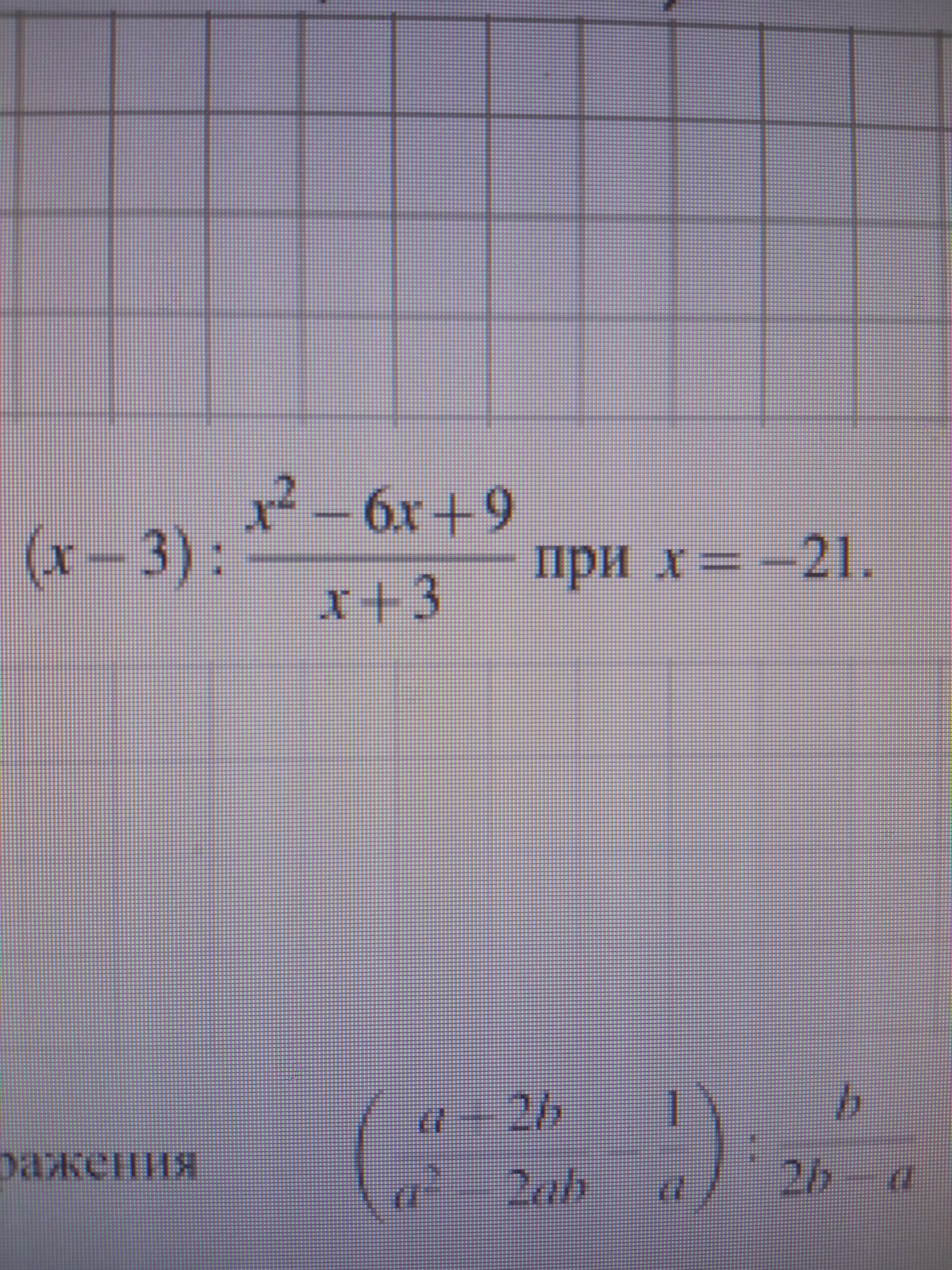 (x-3):\frac{x^2-6x+9}{x+3} =(x-3)*\frac{x+3}{x^2-6x+9}=(x-3)*\frac{x+3}{(x-3)^2}  =\frac{x+3}{x-3} \\ \\ \frac{-21+3}{-21-3}=\frac{-18}{-24}  =\frac{3}{4} =0.75