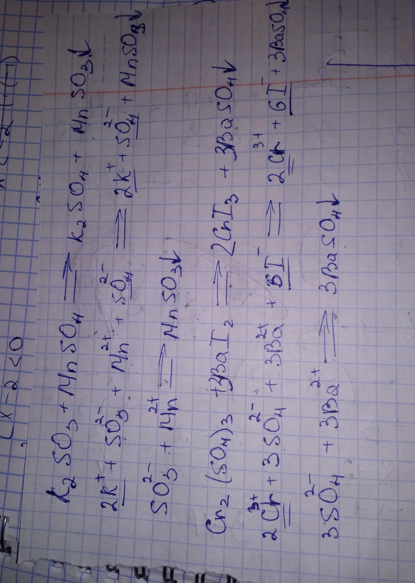 напишите уравнение следующих реакций в молекулярном полном ионном и сокращённом ионном виде K2SO3+MnSO4 , Cr2(SO4)3+Bal2