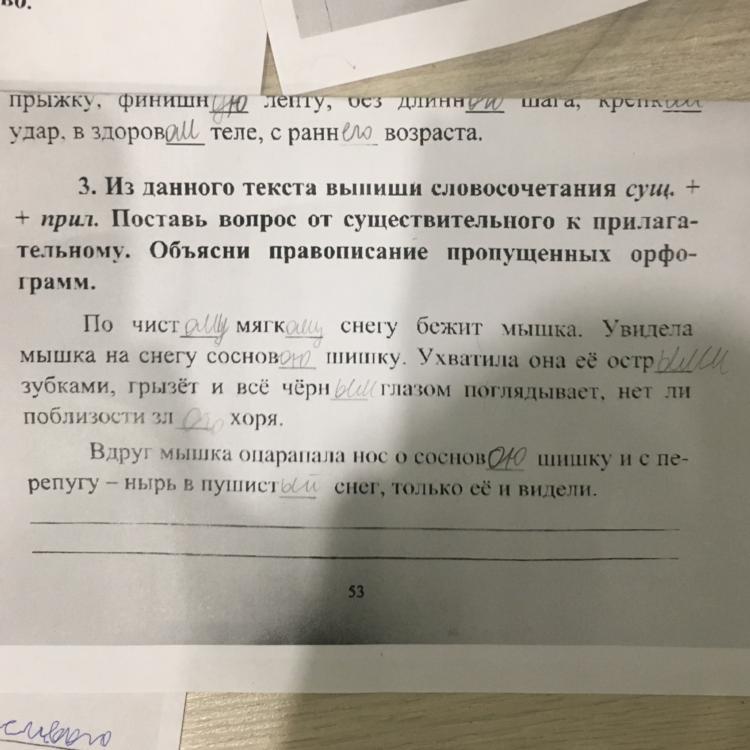 чистому снегу(снегу (какому?) чистому), мягкому снегу(снегу(какому?)мягкому,увидела шишку(увидела(что?) шишку(шишка-В.п.), сосновую шишку(шишку(какую?)сосновую), острыми зубками(зубками(какими?) острыми, ухватила зубками(ухватила(чем?)зубками), чёрным глазом(глазом(каким?) чёрным), поглядывает глазом(поглядывает (чем?) глазом?, злого хоря(хоря(какого?злого), пушистый снег(снег (какой?) пушистый)