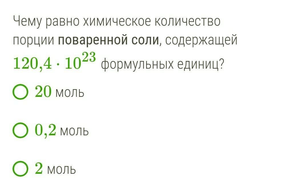 Чему равно химическое количество порции поваренной соли, содержащей 120,4⋅1023 формульных единиц?