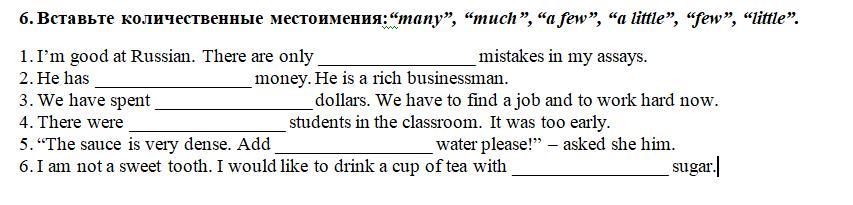 Вставьте количественные местоимения:“many”, “much”, “a few”, “a little”, “few”, “little”.