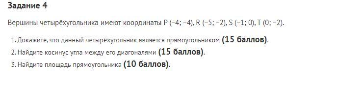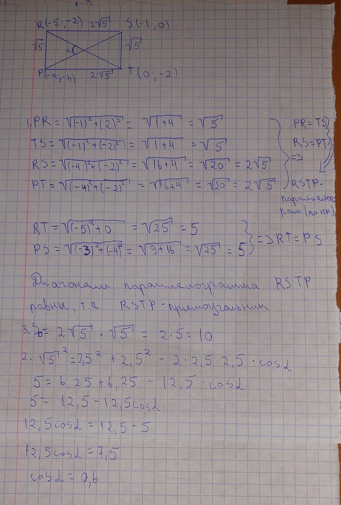 2. PS={-1+4;0+4}={3;4}; RT={0+5;-2+2}={5;0}; |PS|=sqrt(9+16)=5; |RT|=sqrt(25+0)=5; (RT*PS)=3*5+4*0=15. CosO=15/(5*5)=3/5; O=arccos(0.6)=53.13градуса.