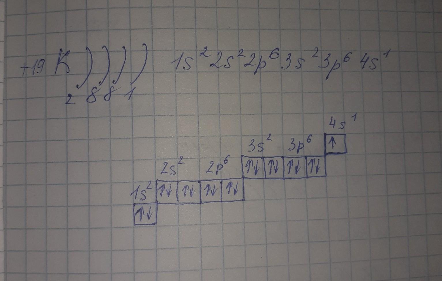 Запишите электронную конфигурацию и электронно графическую формулу атома, ядро которого имеет заряд +19 Электронная конфигурация:______________________ Электронно графическая формула: